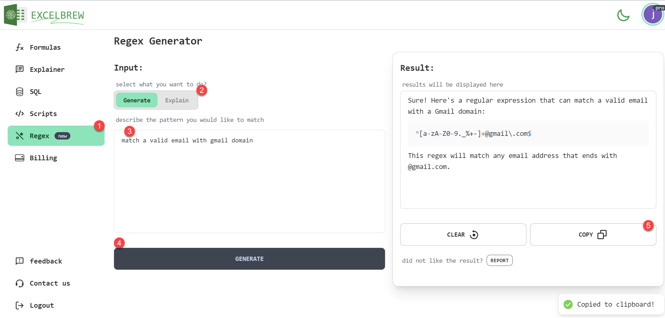 Now comes the fun part. Click on the 'Generate' button and let GptExcel's intelligent AI work its magic. In no time, it will either churn out your tailor-made regex pattern or elucidate your given regex, depending on the selected action.